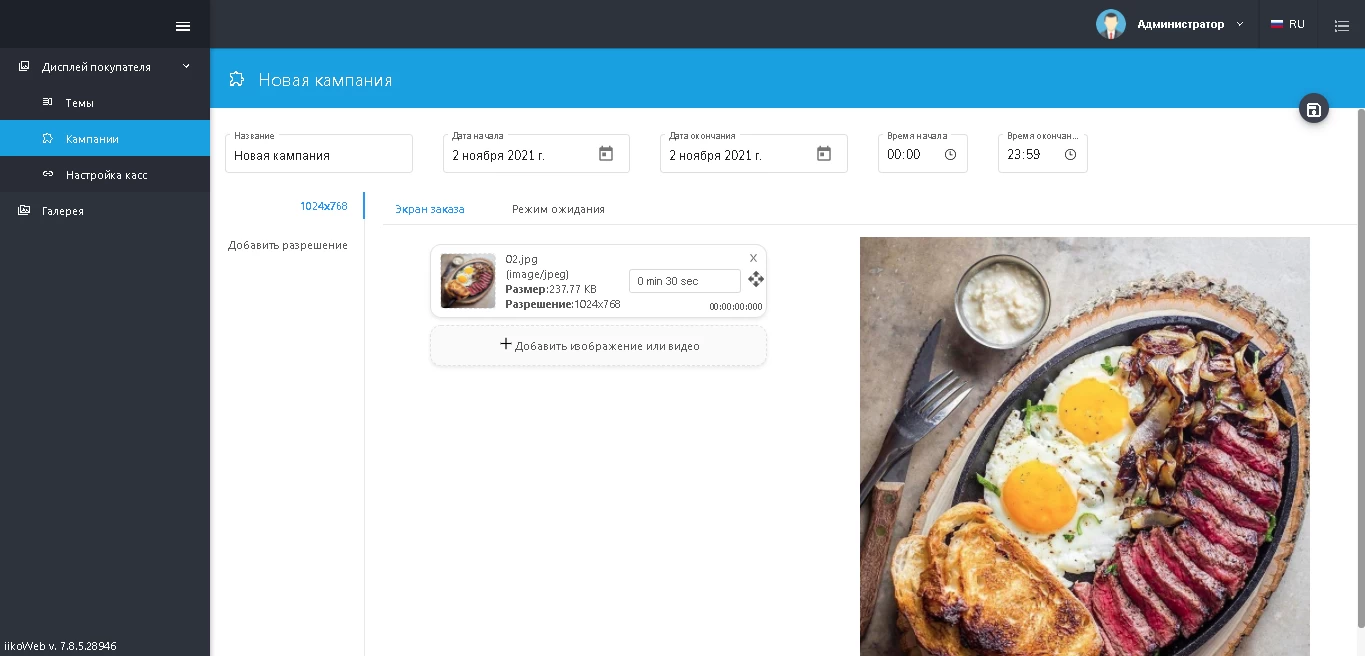 Чтобы настроить рекламную кампанию необходимо перейти в Дисплей покупателя → Кампании. Создайте новую кампанию и укажите ее название, а также дату и время начала и окончания действия. Затем добавьте необходимые видео или изображения, после чего укажите время, за которое изображение сменяется на следующее по списку.