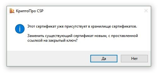 10. Если откроется сообщение «Этот сертификат уже присутствует в хранилище сертификатов. Заменить существующий сертификат новым, с проставленной ссылкой на закрытый ключ?», нажмите Да: